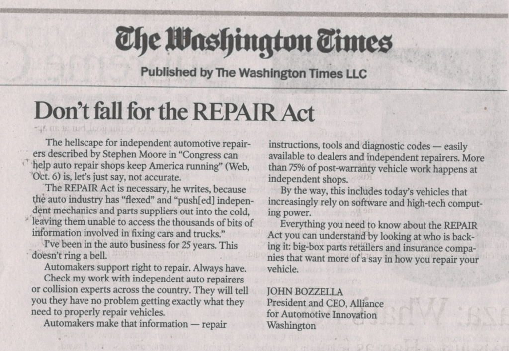 The hellscape for independent automotive repairers described by Stephen Moore in “Congress can help auto repair shops keep America running (Web, Oct. 6) is, let’s just say, not accurate.